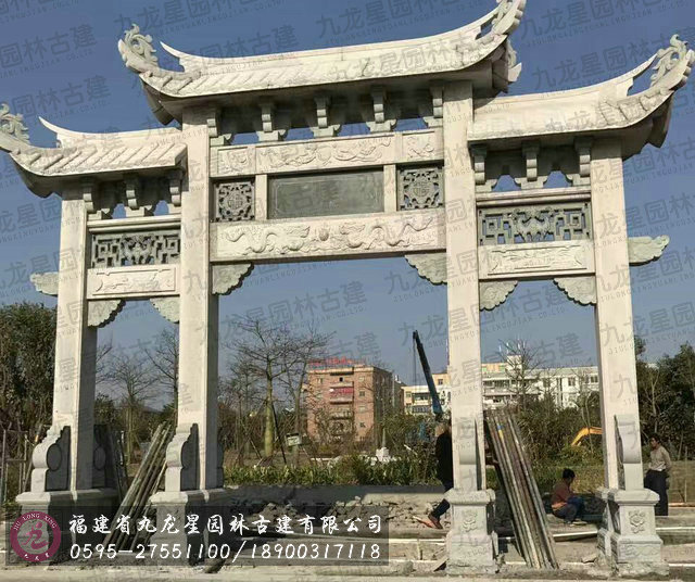 牌坊集中了中國古建筑最有特征的構件組成,有臺座、柱身(包括夾桿石)、梁坊、樓匾、斗拱、樓頂等構件。石造牌坊材質堅固敦實牢靠,且可仿照木結構造型。在藝術處理上,可以在夾桿石、柱子、額坊等處,雕刻各式各樣的花鳥、圖案、龍鳳及各種瑞獸等等,將中國傳統的石刻藝術集中于一身表現出來。中國民俗專家講:“石雕不開光是石雕工藝品,開光后就是具有靈氣的風水神器。”所以“非寧靜無以致遠,非精誠無以神明。” 石牌坊是用石修建的牌坊,是一種裝飾建筑物。柱石的上方刻有麒麟、獅子,夾柱石的浮雕有雙獅戲彩珠,牌坊上還雕刻著其他怪獸云紋。兩側基石柱各有撐鼓,石柱兩側配有石獅。牌坊運用浮雕、透雕等手法,是我國建筑藝術的一大特色。