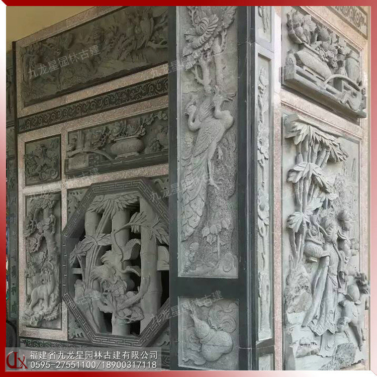 石雕浮雕壁畫在古建筑外墻中占據(jù)重要的地位。古建筑的石雕浮雕在內(nèi)容、形式和材質(zhì)上與圓雕一樣豐富多彩。建筑石雕浮雕常見的材料有青石、花崗巖、白麻、芝麻黑、羅源青、古田青等等。浮雕的雕刻技藝和表現(xiàn)體裁與圓雕基本相同。